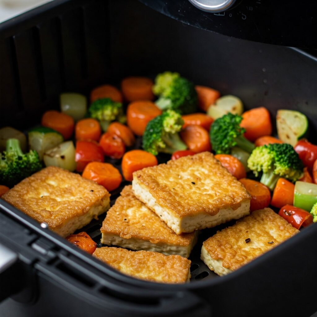 - Coloca el tofu en la air fryer y cocina a 200°C por 12-15 minutos, agitando a mitad del tiempo.